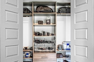 Easily organize your reach‑in closet with custom shelves, pull-out drawers, hanging space, and smart storage solutions.